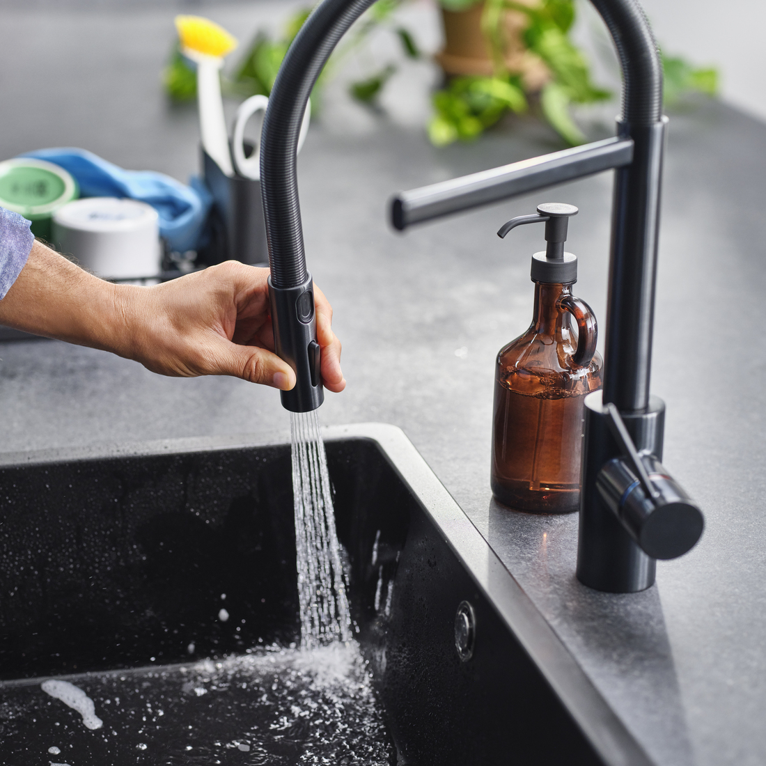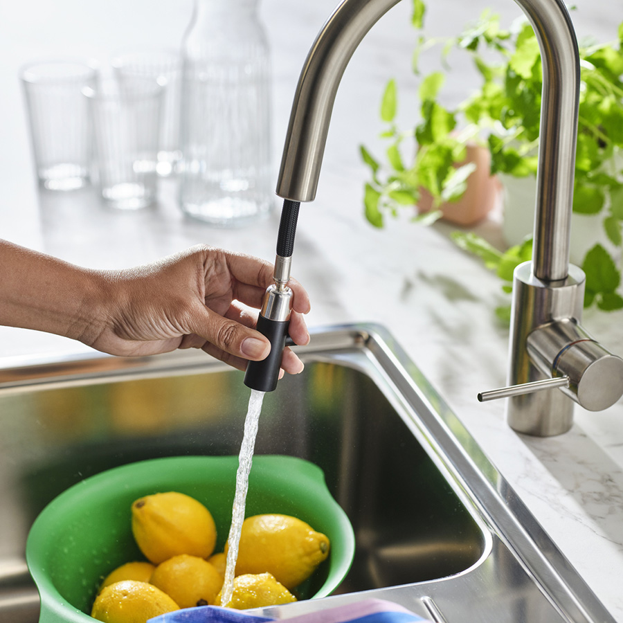 IKEA致力研究在家中節約用水的新方法,同時確保無損實用功能。所有廚房水龍頭都設有加氣裝置,可混合水和空氣,維持水流穩定,卻能大大減少用水量。如果水龍頭有拉出式或下拉式噴頭,方便將水流精準朝向所需位置,便能控制用水量,避免浪費。