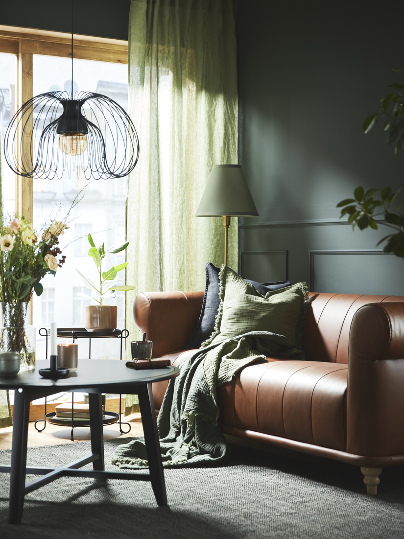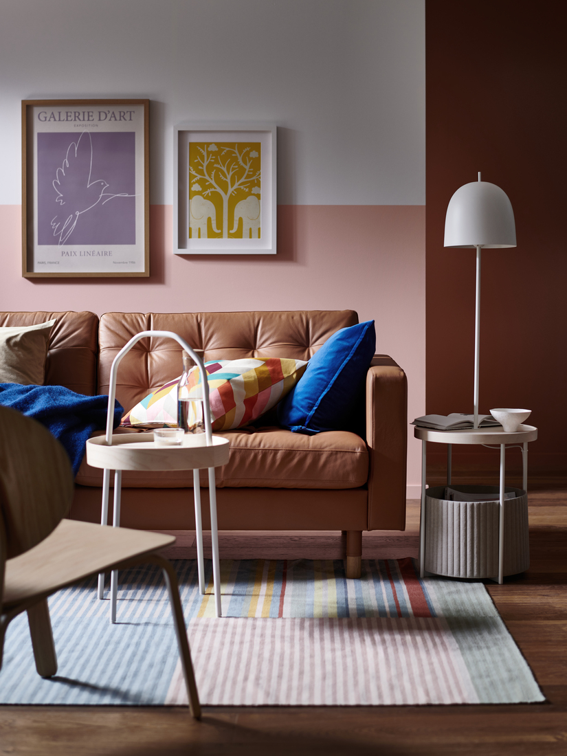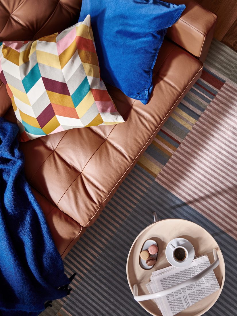 在色彩配搭上不妨大膽一點,布置時可以運用對比色,例如以藍色咕𠱸和輕便暖被配搭啡色LANDSKRONA梳化,為空間增添活力。藍色亦能和諧地平衡其他顏色的咕𠱸和地氈與梳化。