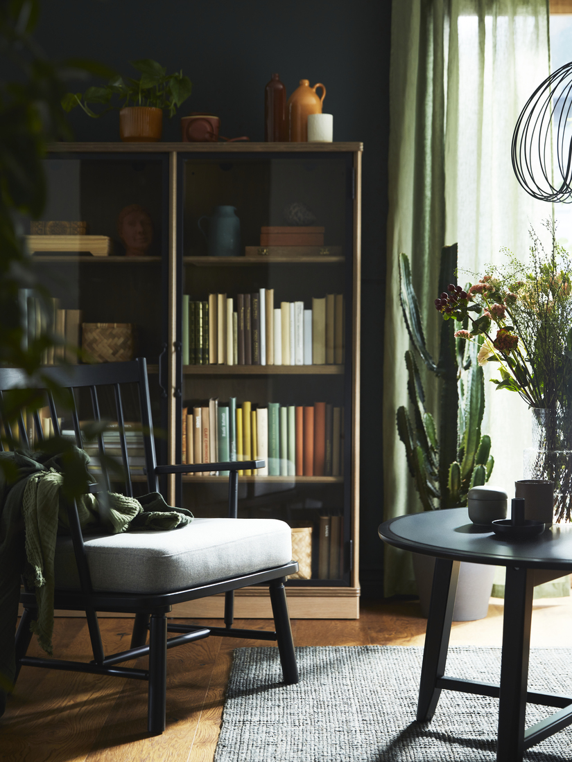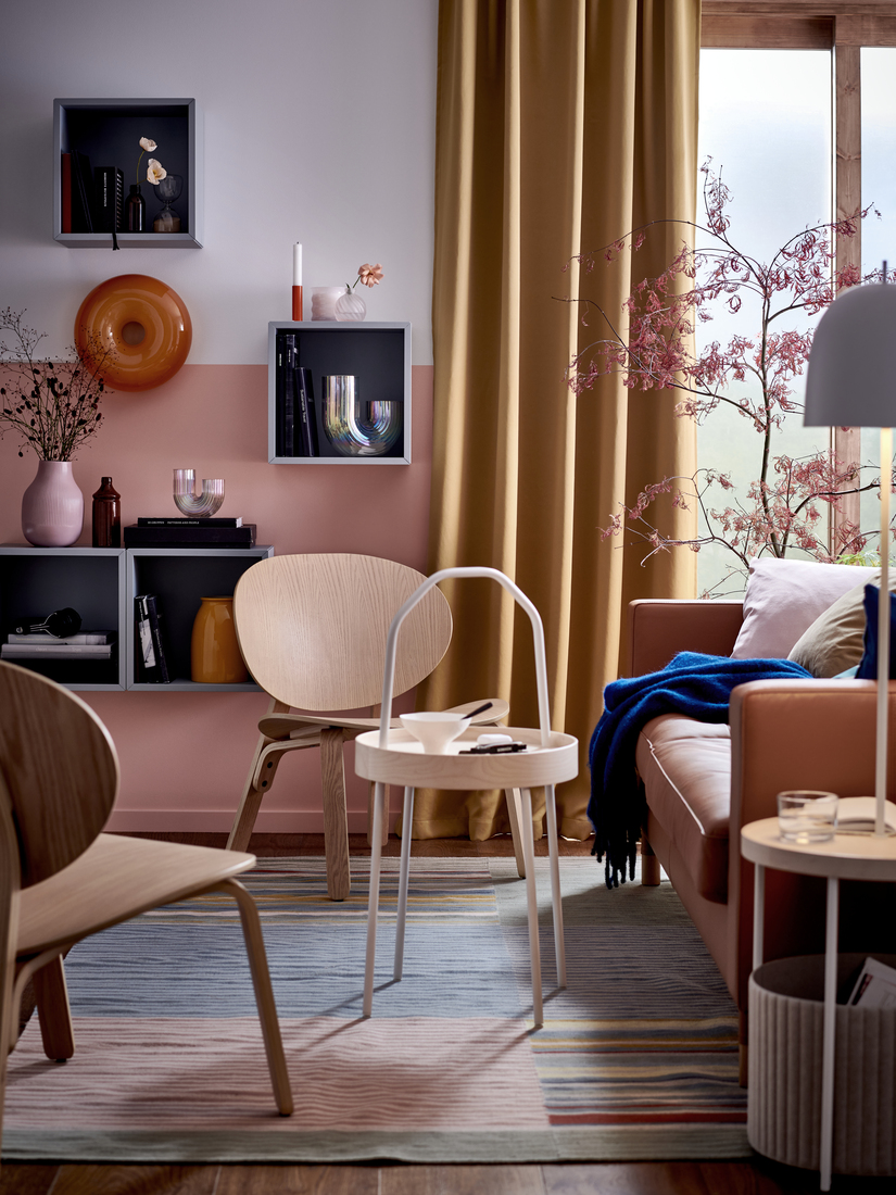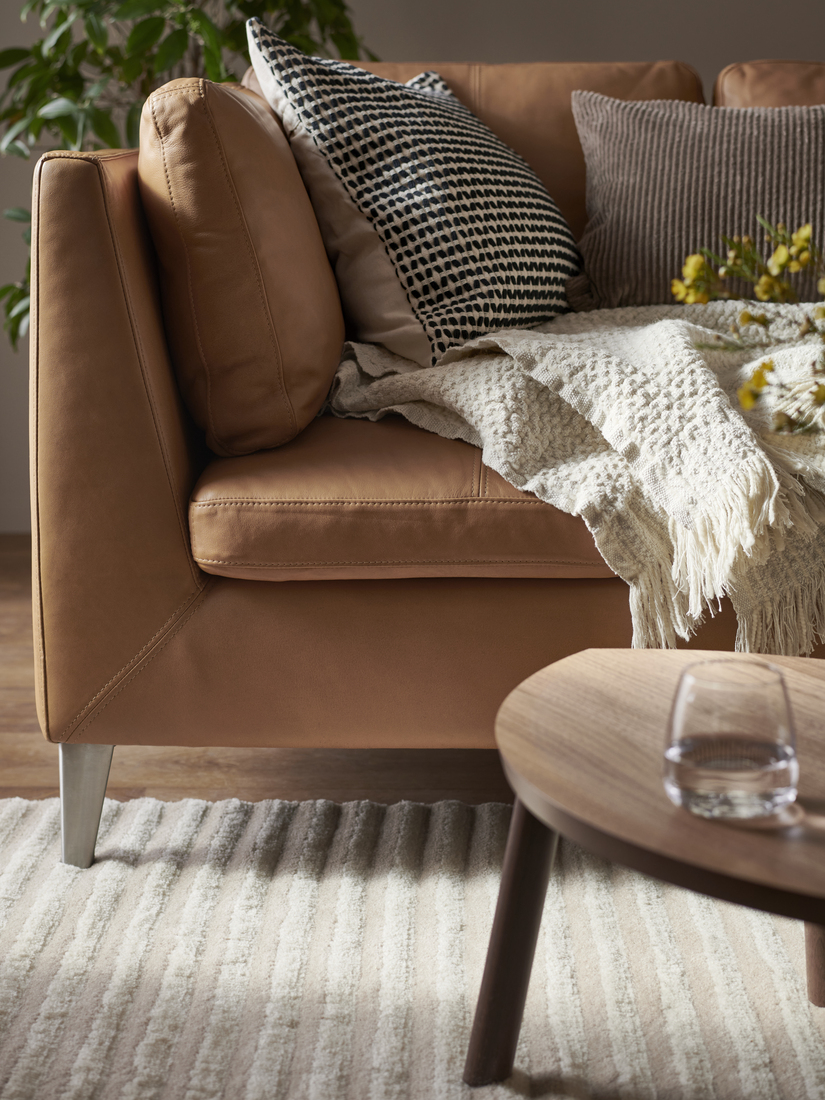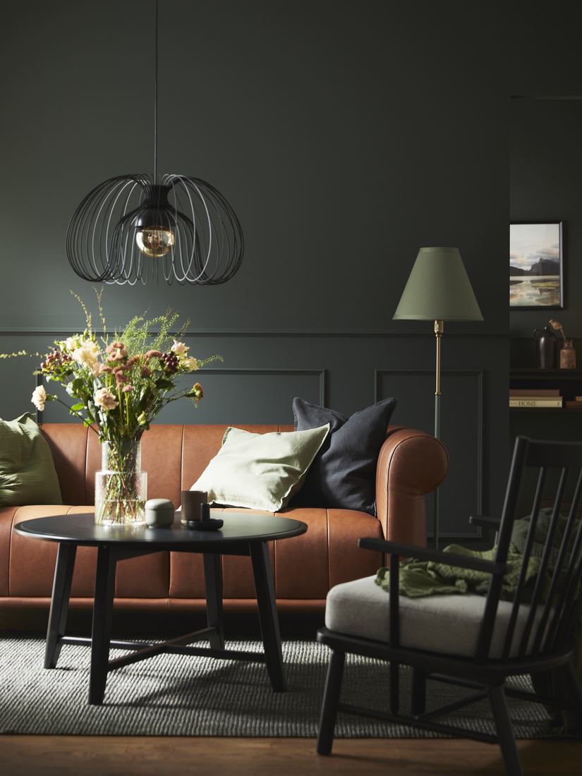 在色彩配搭上不妨大膽一點,布置時可以運用對比色,例如以藍色咕𠱸和輕便暖被配搭啡色LANDSKRONA梳化,為空間增添活力。藍色亦能和諧地平衡其他顏色的咕𠱸和地氈與梳化。