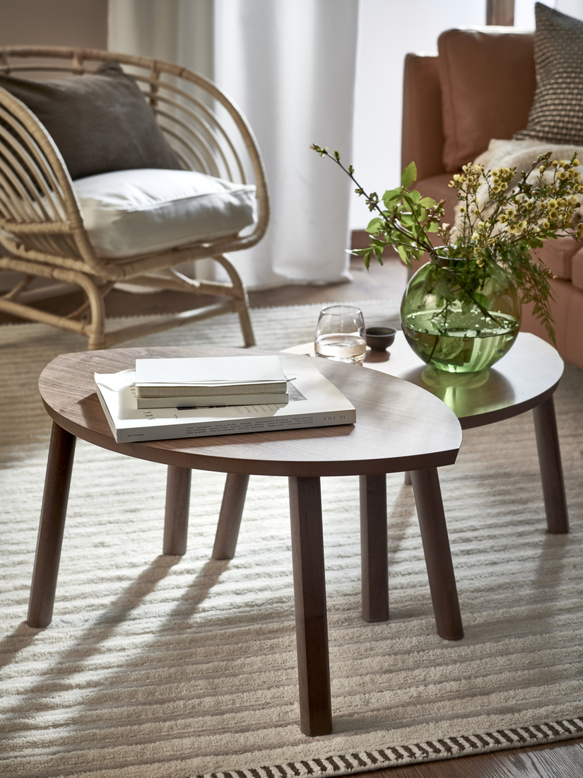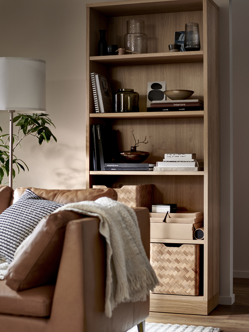 咖啡枱、茶几和書櫃不僅提供方便的儲物空間,還能幫助你營造梳化周圍的整體風格。 小物件也能強化你所選擇的風格。在這裡,插著鮮花的花瓶和竹籃,為這個區域增添了一份平靜、貼近自然的氛圍。