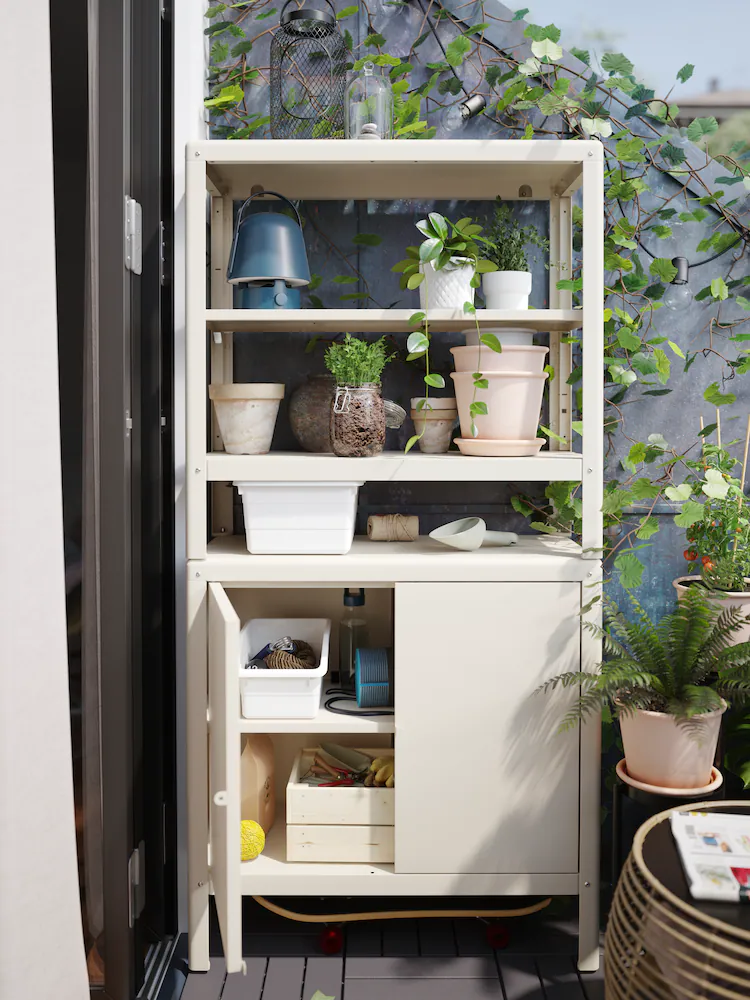 好好運用牆壁高度擺放儲物櫃和層架,是增加儲物空間的妙法,而且不需要佔用太多地面空間。結合開放式和封閉式儲物組合,便可以將不想看到的物品統統收起,例如花泥和園藝工具,而漂亮的植物就能成為層架上的焦點。
