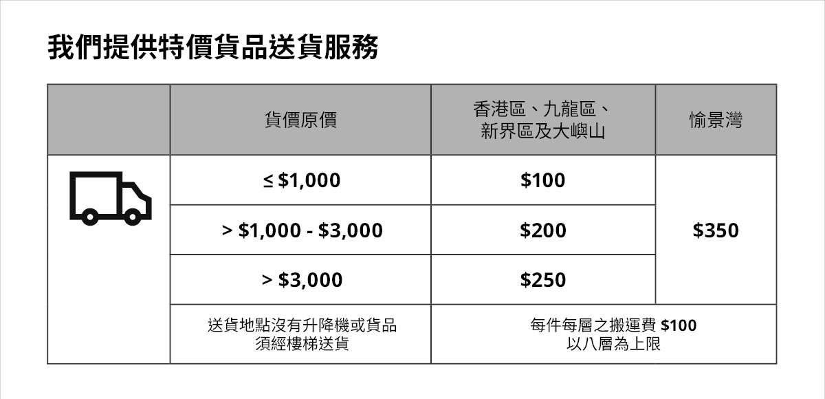 如需協助或借用手推車,請與顧客服務部聯絡。我們可提供輕型貨車供應商的聯絡方法,協助你將貨品送到府上。